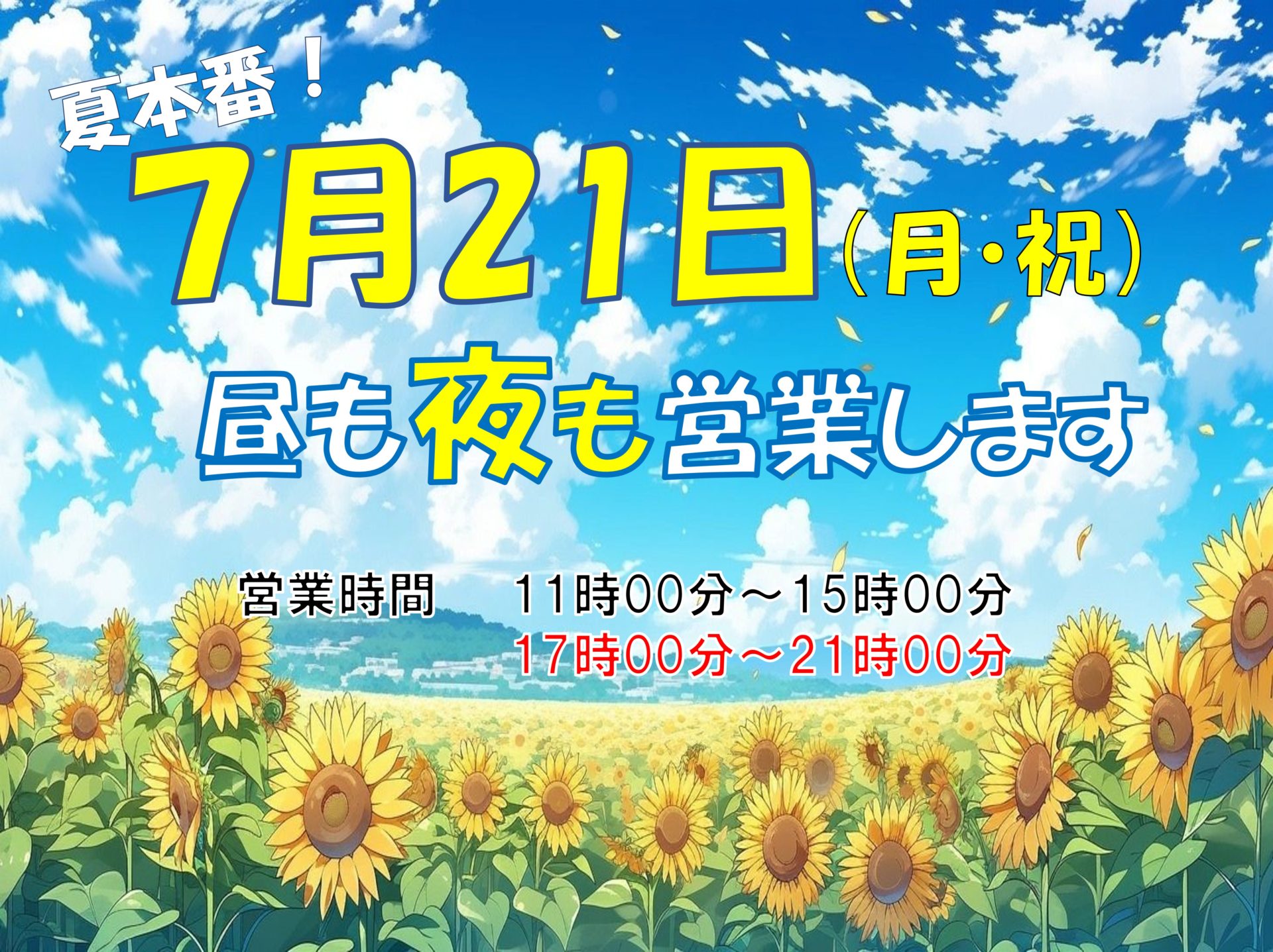 営業情報 UPDATE2025.07.19 【7/21】ディナータイムも営業します 7月21日(月・祝)の営業時間の変更についてお知らせします。 7月21日は祝日ですが、ディナータイム(17時~21時)も営業いたします。 どうぞご利用ください。お席のご予約も承っております。
