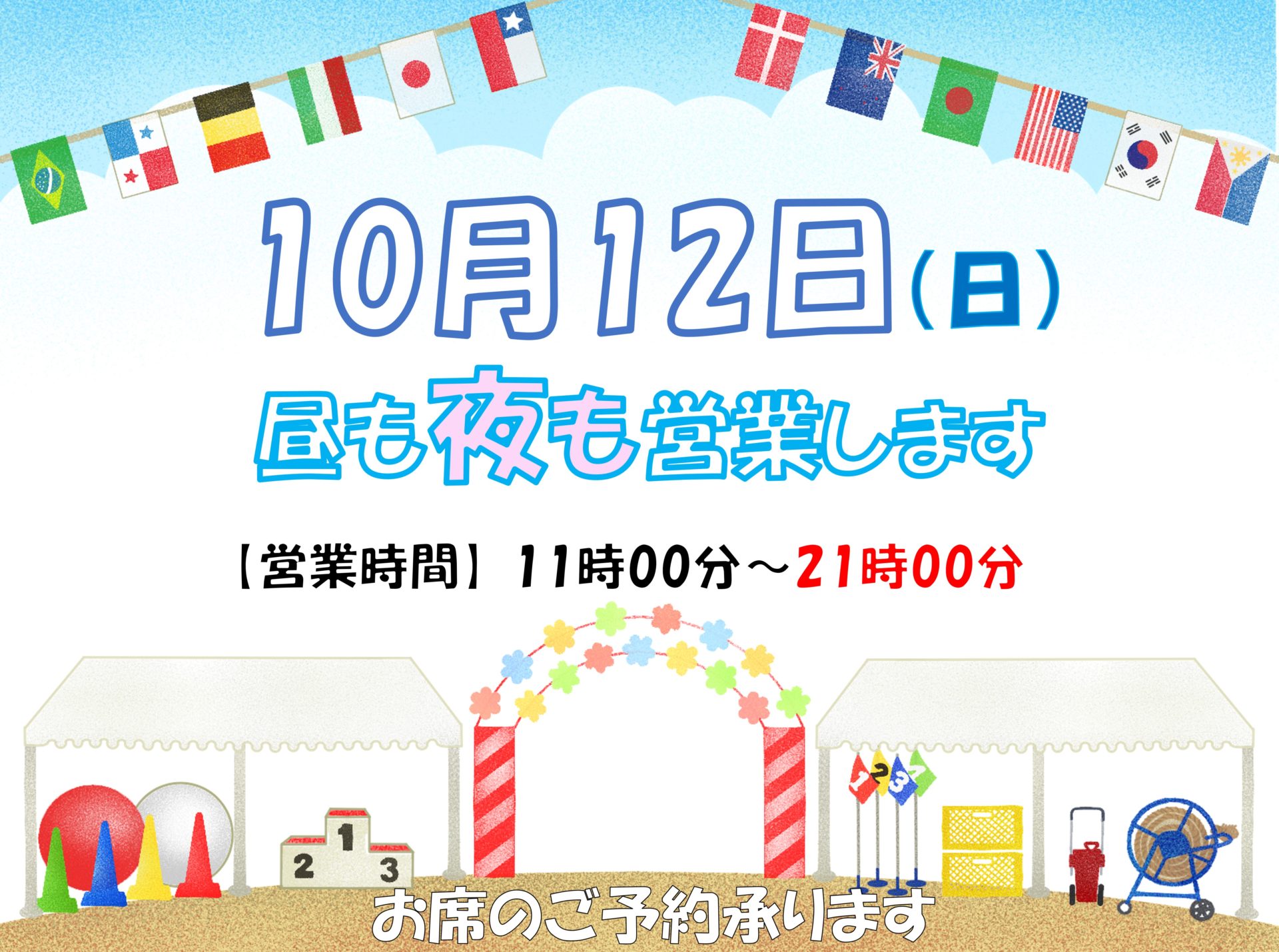 営業情報 UPDATE2025.09.28 【10/12】営業時間の延長(ディナータイム営業) 10月12日(日)は通常のラインタイム営業に加えてディナータイムも21時まで追加で営業いたします。(途中休憩なしで21時まで連続営業です) 運動会の打ち上げなどに是非ご利用ください。ご予約も受け付けております。