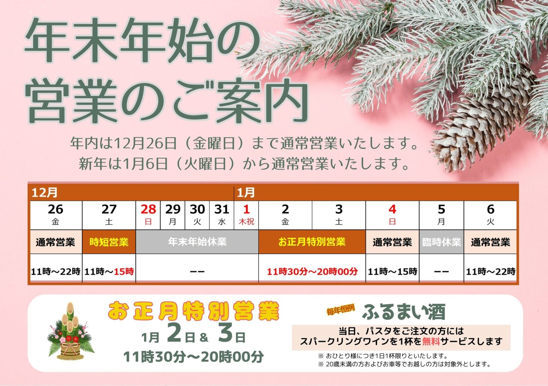 1月2日および1月3日はお正月特別営業として、11時30分から20時00分まで営業いたします。(通常と営業時間が異なりますのでご注意ください)お正月特別営業では毎年恒例の「ふるまい酒」があります。パスタをご注文の方にはスパークリングワイン1杯を無料でサービスいたします。