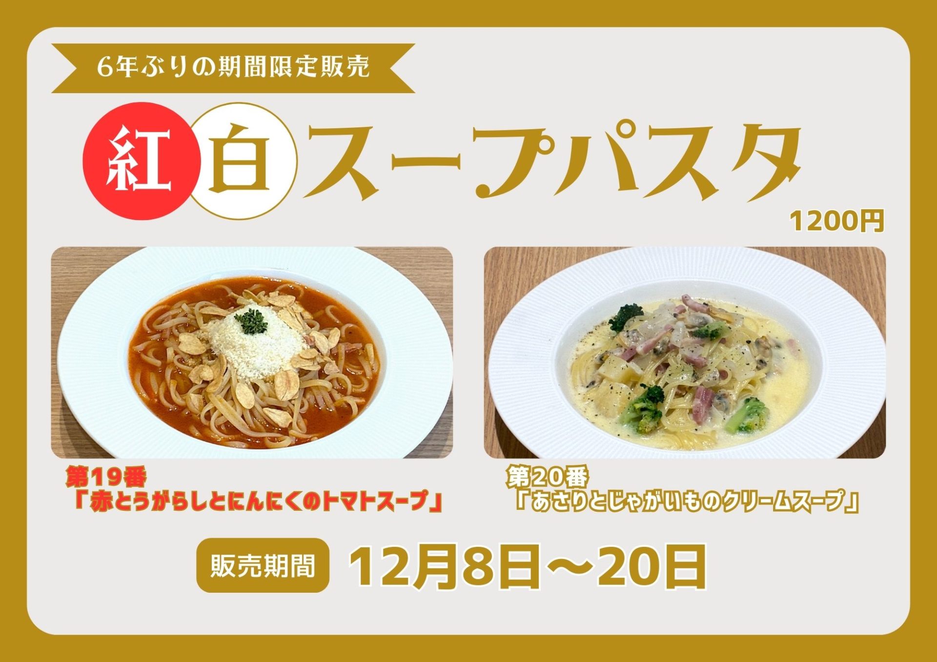 12月8日から20日まで2種類のスープパスタを販売いたします。価格は税込み1200円です。