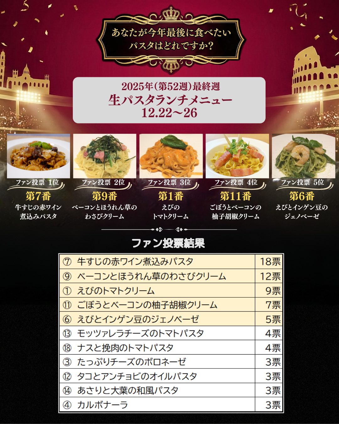 【ファン投票結果】2025年最終週のランチメニューのパスタにつきまして
