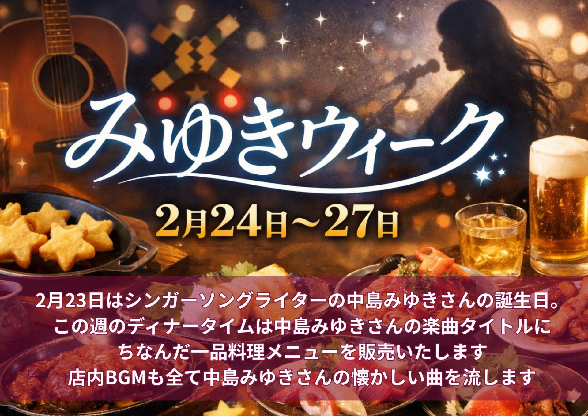 中島みゆきさんのお誕生日をお祝いして、2月24日~27日の4日間のディナータイムはみゆきさんの楽曲にちなんだ一品メニューを販売します。