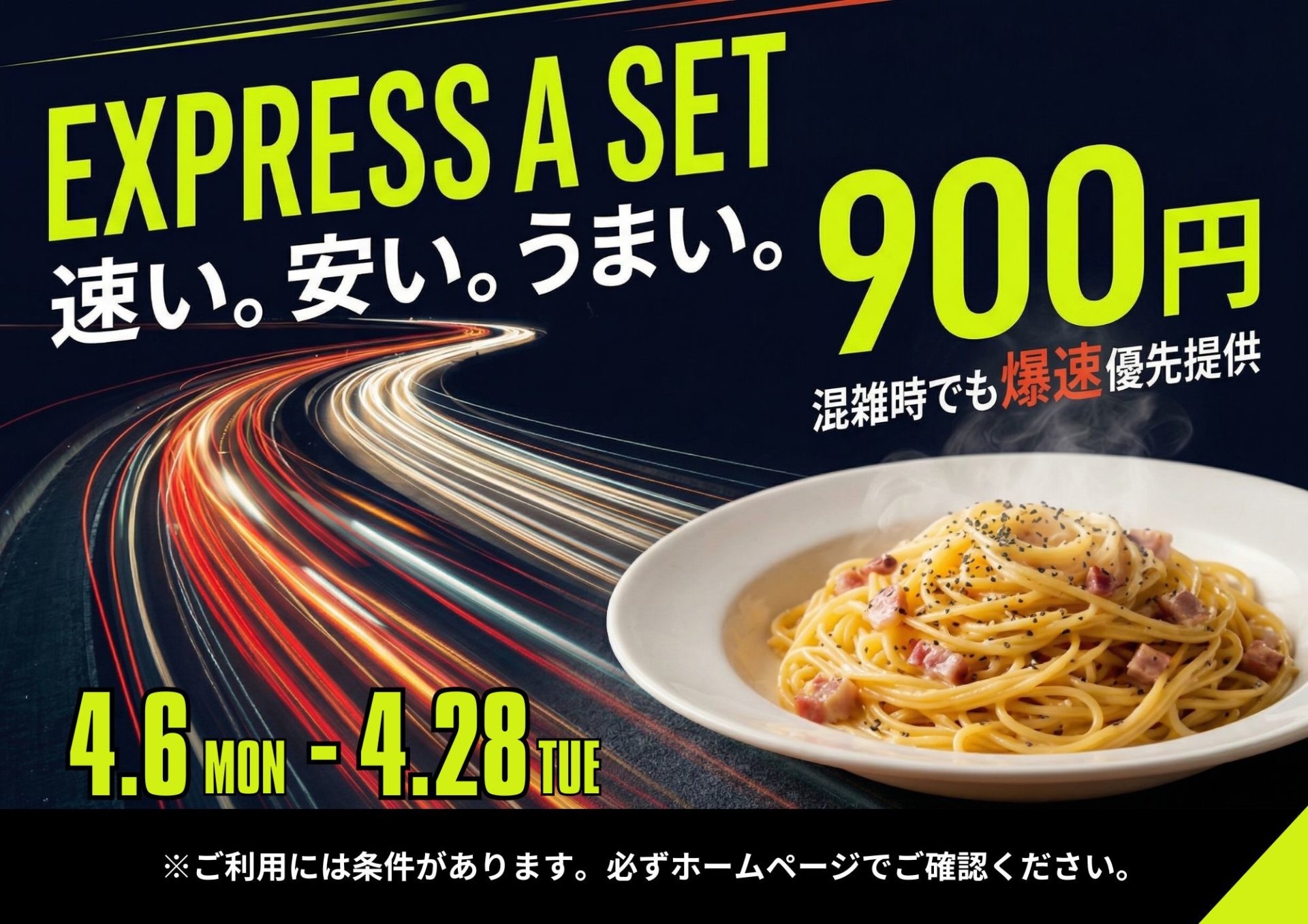 今年も4月6日から28日までの約3週間、Express Aセット(エクスプレスAセット)をランチメニューとして販売いたします。通常の生パスタランチAセットの内容が200円お安い900円でお召し上がりいただけ、しかも混雑時でも他のお客様に優先して爆速でお料理を提供します。